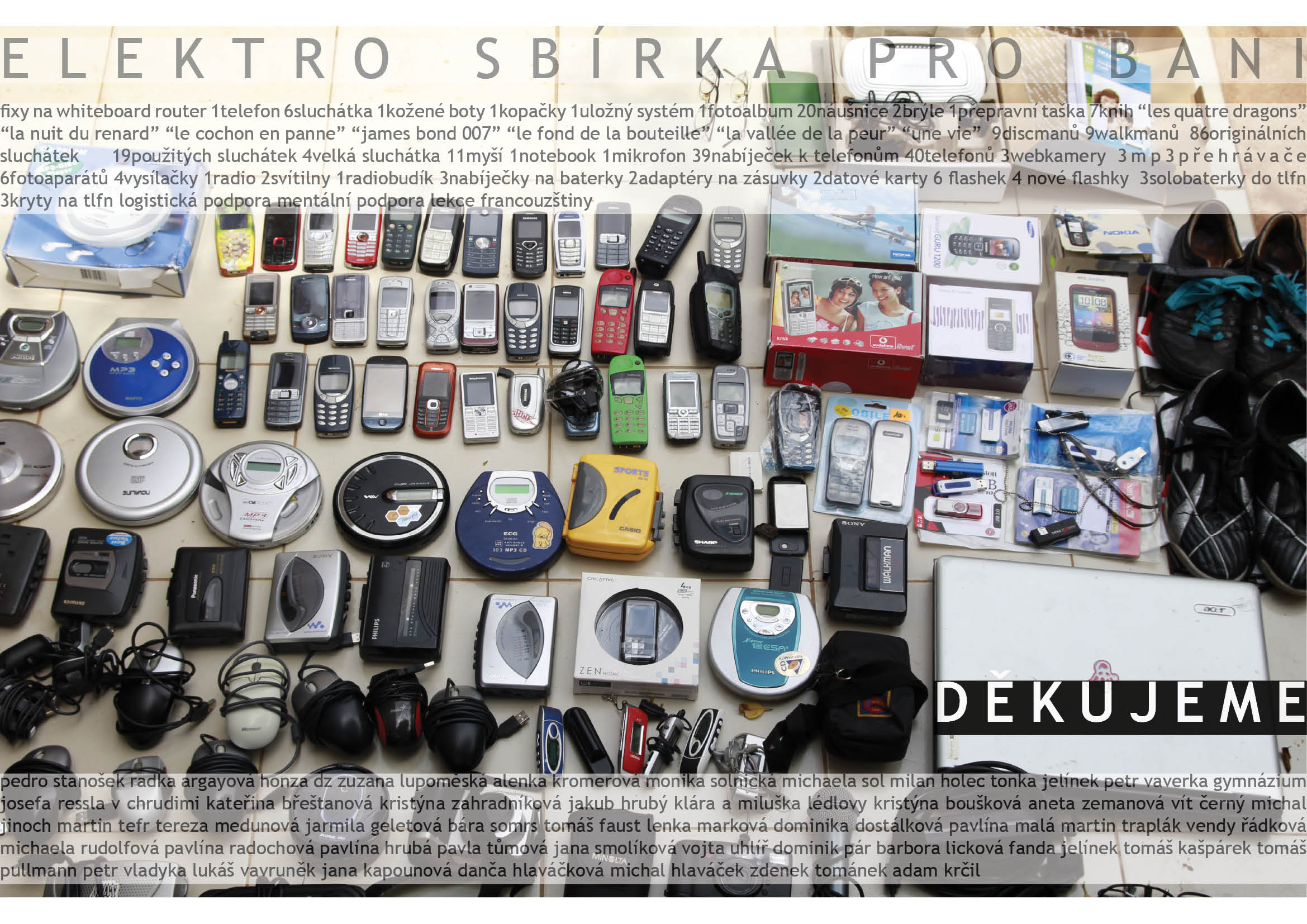 The collection was pretty successful – about 30kgs – whiteboard colours _ router _ pair of leather shoes _ pair of football shoes _ stockage system _ photoalbum _ 2glasses _ travell bag _ 7books: “les quatre dragons” “la nuit du renard” “le cochon en panne” “james bond 007” “le fond de la bouteille” “la vallée de la peur” “une vie” _ 9discmen _ 9walkmen _ 86original plug-ins _ 19second hand pug-ins_ 4 headphones _ 11mice _ 1notebook _ 1microphone _ 39phone rechargers _ 40cellphones _ 3webcameras _ 3mp3players _ 6cameras _ 4remoted speakers _ 1radio _ 2lamps _ 1radioalarm _ 3rechargers for batteries _ 2socket adaptations _ 2SDcards _ 6USBkeys _ 4original USBkeys _ 3phone batteries _ 3phone covers _ and a lot of other support