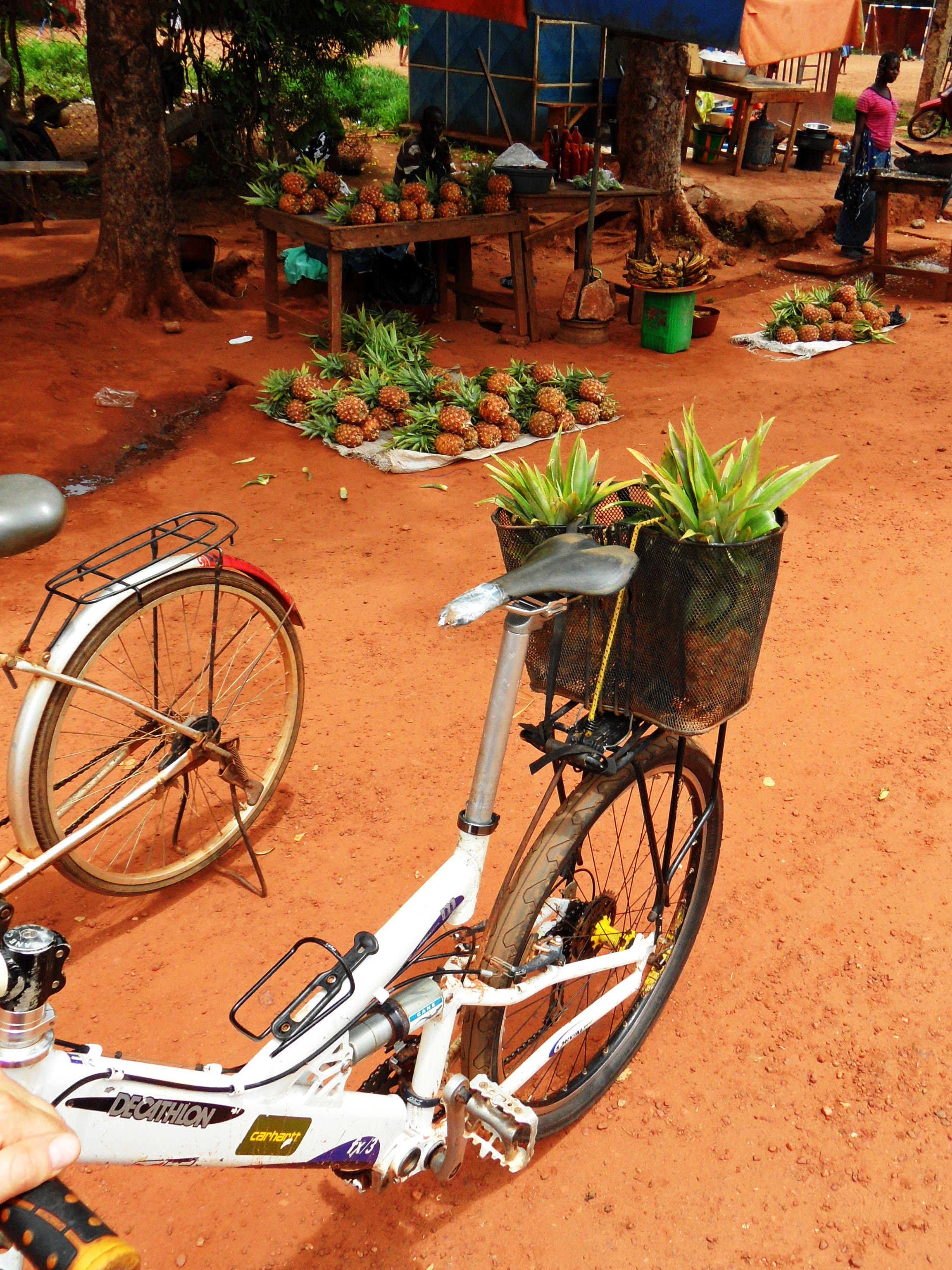 Day off, finally. Getting back my old bike and going for shopping. The train from Abidjan just arrived. Loads of pineapples, avocados and atieke appeared on the ground in front of the Sitarail railway station building.