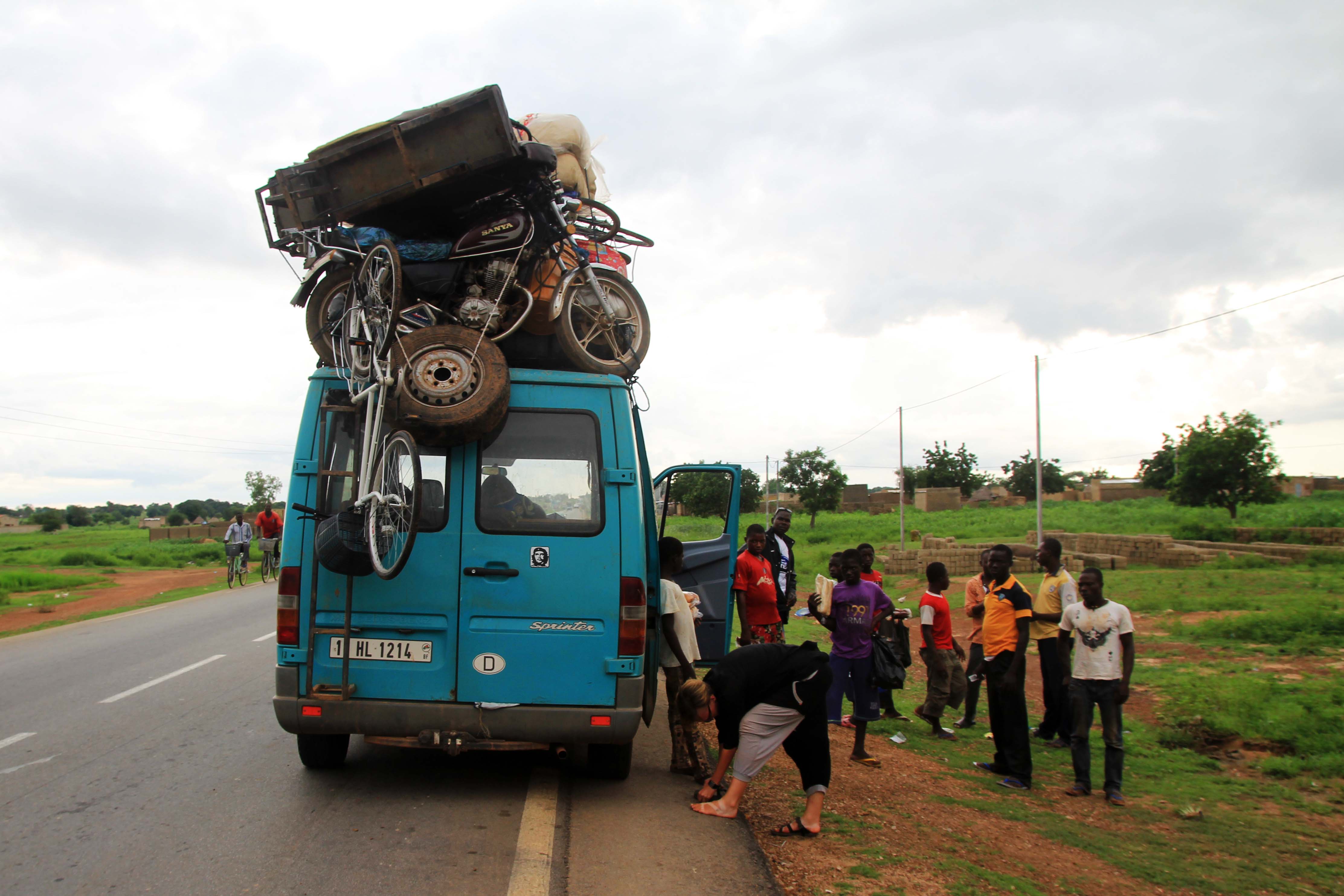 200km done in 5 hours, the migration procedure is quite fast… at 13h we are in Burkina Faso again. Looking for a lift to Ouagadougo – it is 240km. The road is very bad, so my “inner soly” didnt want to get on the bus with a driver on drogues and prefered the “taxi-brousse” (on the picture). It is slower than the bus, but safer… I had estimated 4 hours maximum to get “home”. We have arrived after 8 hours of travelling. And we have met THE bus that had accident with a car, fortunately it was not mortal accident…